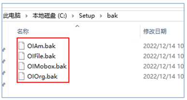 - Bak里面包括4個(gè)數(shù)據(jù)庫(kù)(OIAm、OIMobox、OIOrg、Oifile)的bak文件 (參考下圖)
